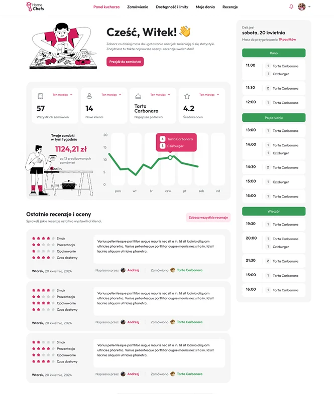 decydujesz, co i kiedy gotujesz. Tworzysz menu, ustalasz ceny i zarabiasz legalnie z domu. Kurier odbiera dania i dostarcza je klientom.