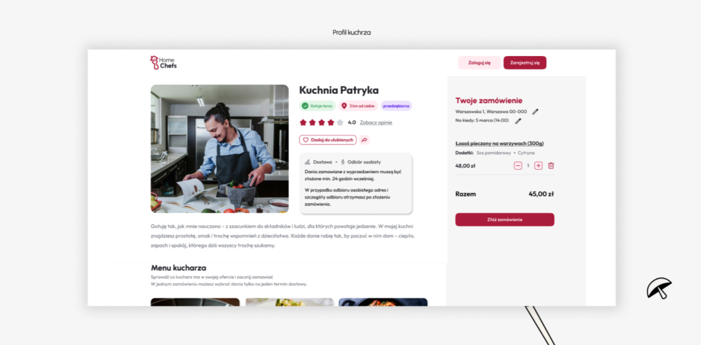 Wejdź na kucharze.homechefs.pl, kliknij „Zarejestruj się”, wypełnij podstawowe dane i stwórz swoje konto. To nic nie kosztuje. Rejestracja i prowadzenie konta są całkowicie darmowe. Platforma pobiera prowizję tylko od zrealizowanych zamówień.
